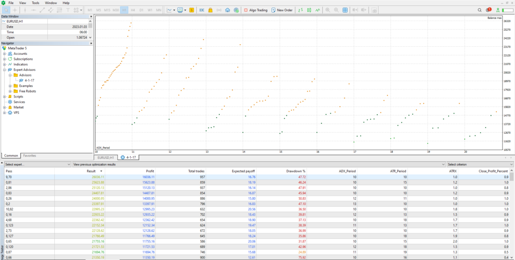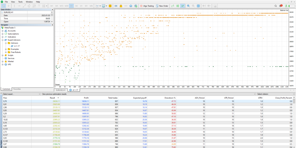 This EA leverages the Ichimoku and ADX indicators for entry signals, initiating Buy orders when the Tenkan-Sen crosses above the Kijun-Sen with ADX above 25, and initiating Sell orders when the Tenkan-Sen crosses below the Kijun-Sen with ADX above 25. It employs a Martingale strategy, doubling the lot size after a loss, with grid intervals determined by ATR values. For exits, the EA uses a unified close approach, closing all open positions in the portfolio simultaneously once a specified percentage of the account balance is reached, optimizing profit capture and risk management.