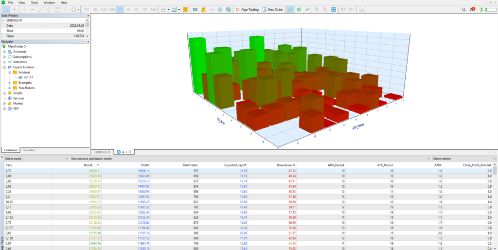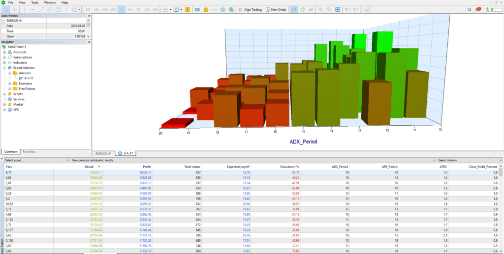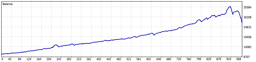 该EA利用一目均衡表和ADX指标作为入场信号:当转换线(Tenkan-Sen)上穿基准线(Kijun-Sen)且ADX高于25时启动买单,当转换线下穿基准线且ADX高于25时启动卖单。它采用马丁格尔策略,在亏损后加倍手数,并根据ATR值确定网格间隔。对于退出,EA采用统一关闭的方法,当账户余额达到特定百分比时,同时关闭投资组合中的所有未平仓头寸,从而优化利润获取和风险管理。